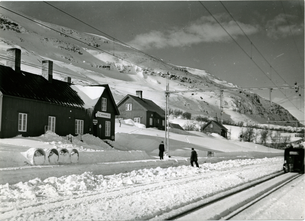 Kopparåsen station. Motordressin med gengasdrift till höger i bild.
