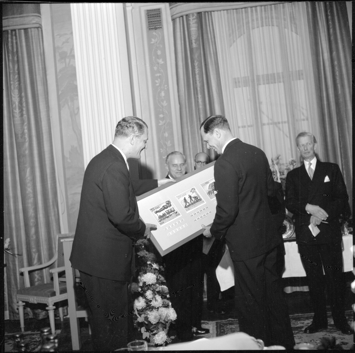 Generaldirektör Erik Upmark tar emot gåvor från Telestyrelsen, Generalpostst NKLJ, NBJ, SJBF, SVJM, KPF, Haeggströms Boktr.