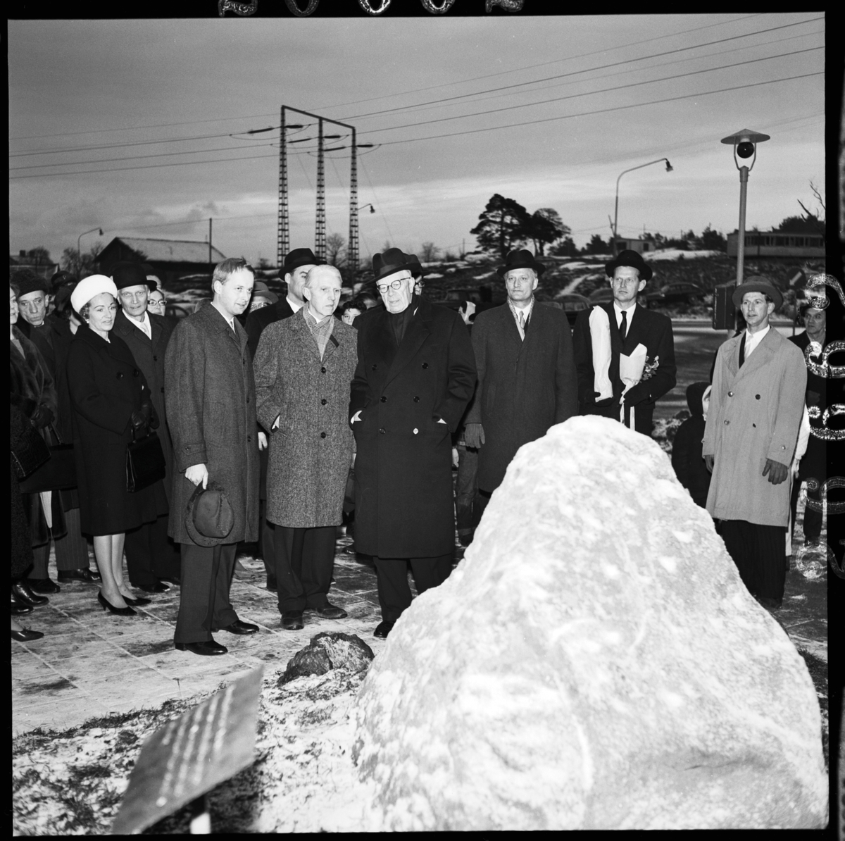 Invigning av Årsta partihandel. Generaldirektör Erik Upmark, 3:a från höger och Kung Gustav VI Adolf, 4:a från höger