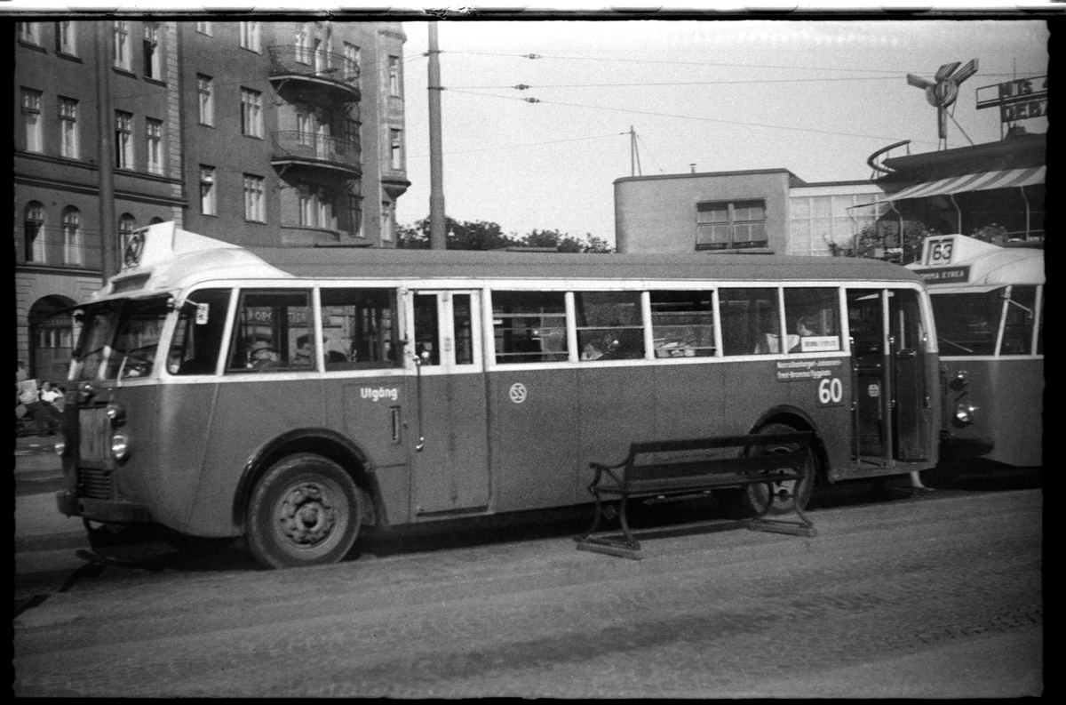 Aktiebolaget Stockholms Spårvägar, SS buss, vid hållplats på linje 60 som utgick från Norra Bantorget - Fridhemsplan - Tranebergsbron - Ulvsundavägen - Johannesfred - Bromma Flygplats.