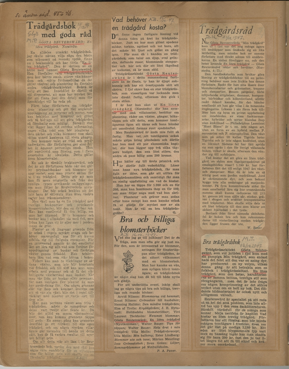 Tidningsklipp ur "Uppsatser om trädgårdar m.m. som på ett eller annat sätt beröra Gösta Reuterswärd. Samlade av Ernst Hj."