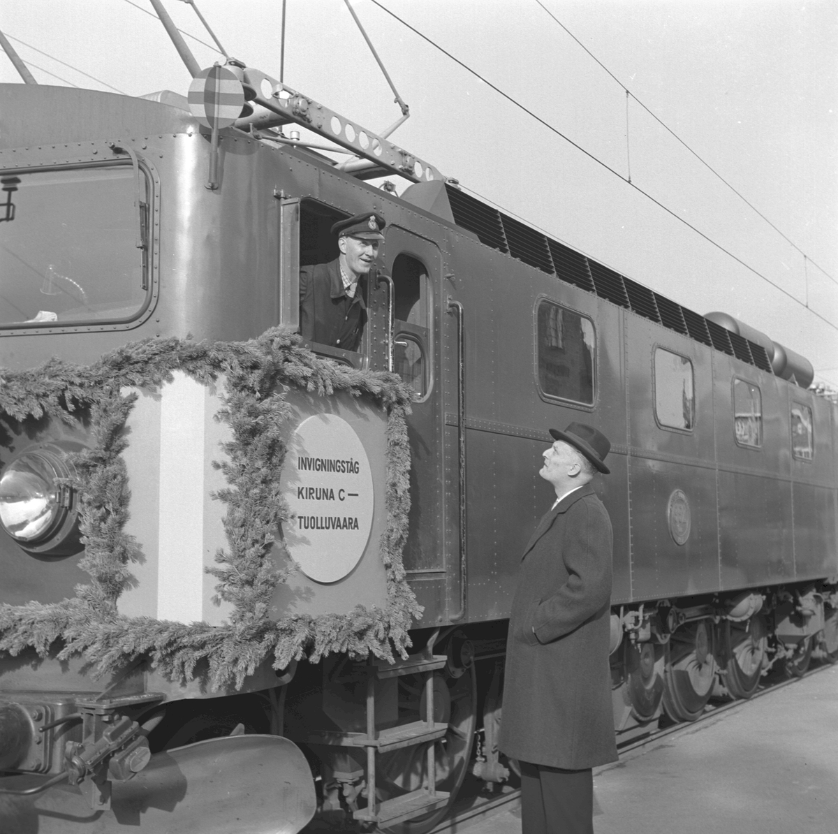 Invigning bansträckan Kiruna C - Tuolluvaara. statens Järnvägar, SJ Dm. Generaldirektör Erik Upmark i samspråk med lokföraren på invigningståget.