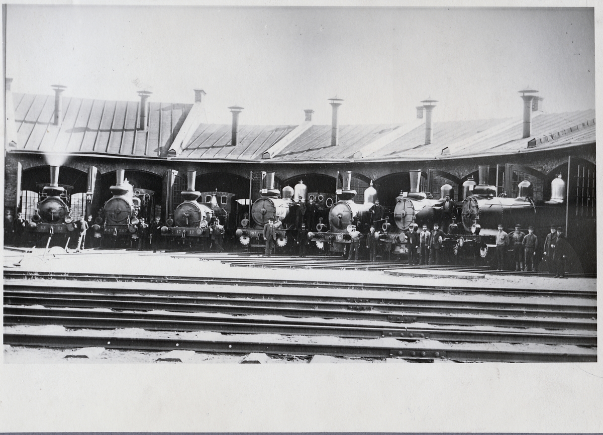 Motala Verkstad Fältmanövern år 1899. Statens Järnvägars lok från vänster: SJ B 53 "Forsete", SJ Da 347, SJ B 17 "Örebro", SJ Kd 397, SJ I 118 "Hilding", SJ Kd2 451 och SJ Kd 389.