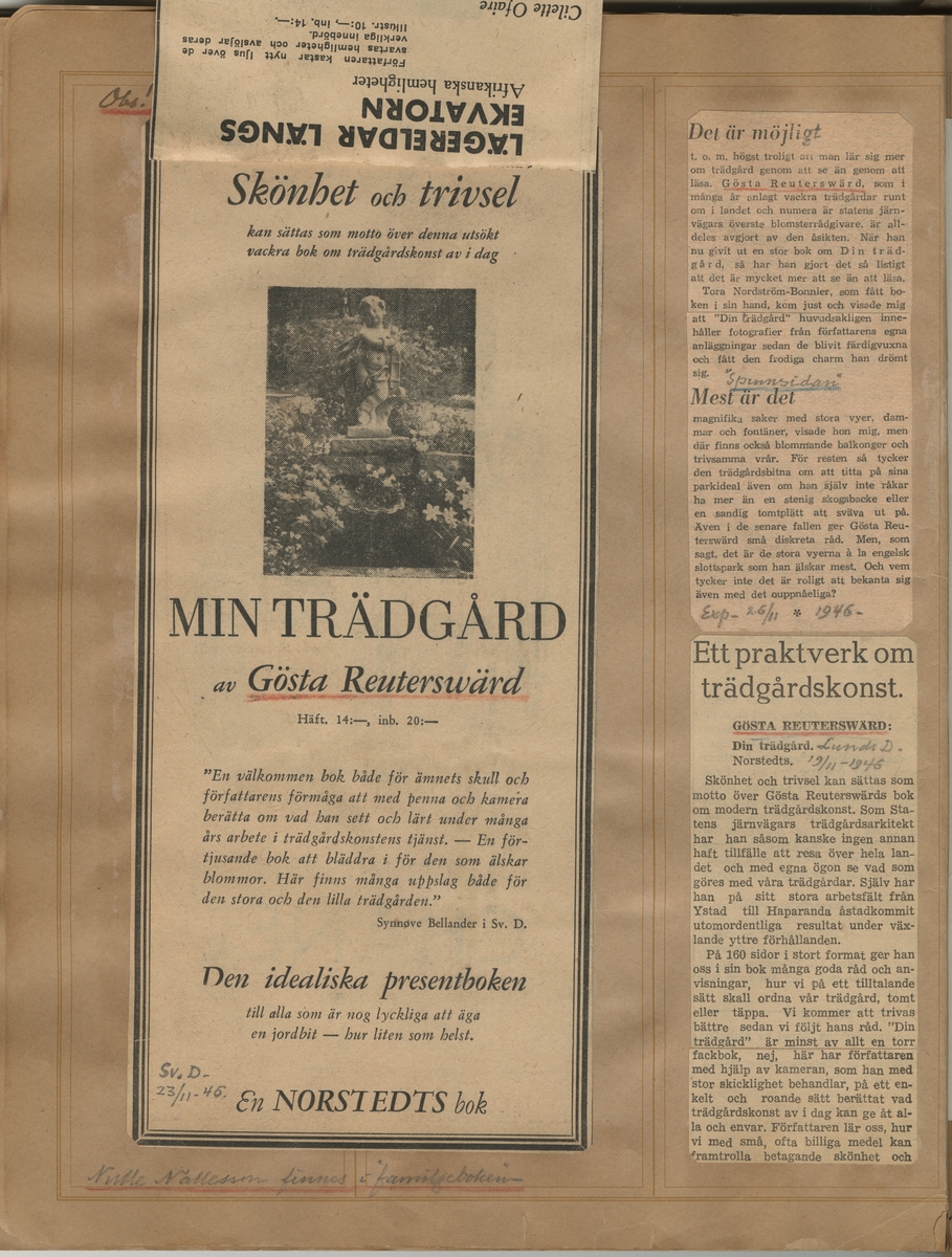 Tidningsklipp ur "Uppsatser om trädgårdar m.m. som på ett eller annat sätt beröra Gösta Reuterswärd. Samlade av Ernst Hj."