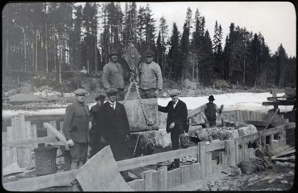 Titel: Pelararen under arbete vid brobygget över Vindelälven.