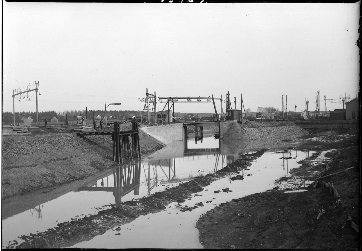 Dubbelspårsarbete. Gårdsjö till Skövde. Bro över Göta kanal vid Töreboda. Arbetsplatsen sedd från väster. Klart för påsläppning av vattnet.