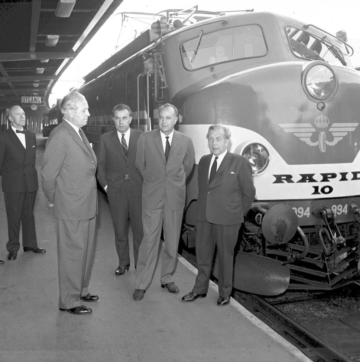 Statens Järnvägar, SJ Ra 994 "Rapid 10". Jugoslavisk delegation. Från SJ Ekonomidirektör, Ekd, A. Sjöberg och från Kommunikationsdepartementet Kommunikationsminister, Kom.min, Gösta Skoglund
