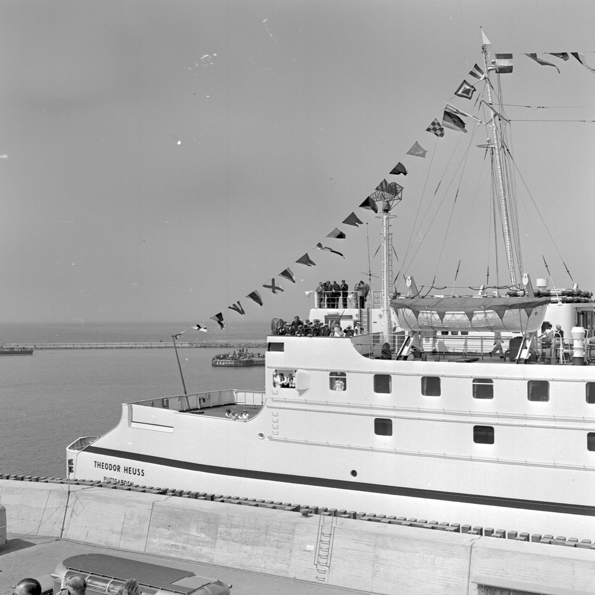 Invigning av "Fågelvägslinjen" mellan Rodbyhavn, Lolland, Danmark och Puttgarden, Fehmarn, Tyskland. Den nya färjelinjen kallas "Fågelvägslinjen", på danska Fugleflugtslinien och på tyska Vogelflugslinie, eftersom linjen följer flyttfåglarnas flygrutt. M/S Theodor Heuss Puttgarden