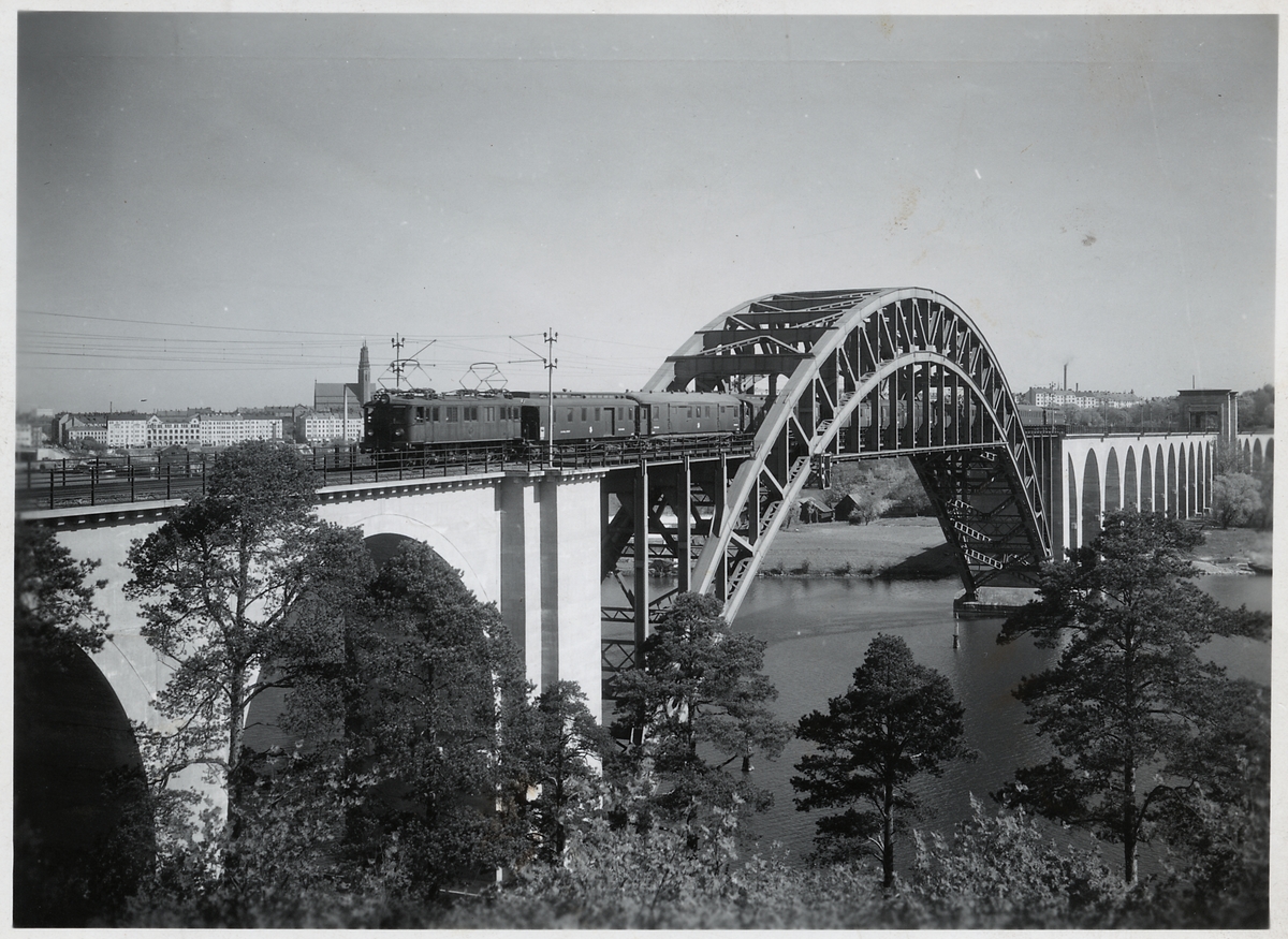 Årstabron med södergående snälltåg, troligen tåg 9 Stockholm - Göteborg. Tåget dras av Statens Järnvägar, SJ D lok.