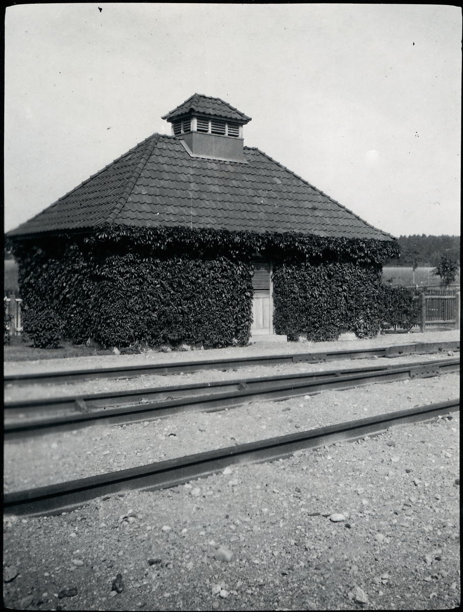 Titel: Dekorativ vildvin skrud på kraftstationsbyggnad vid Åby stationsområde.