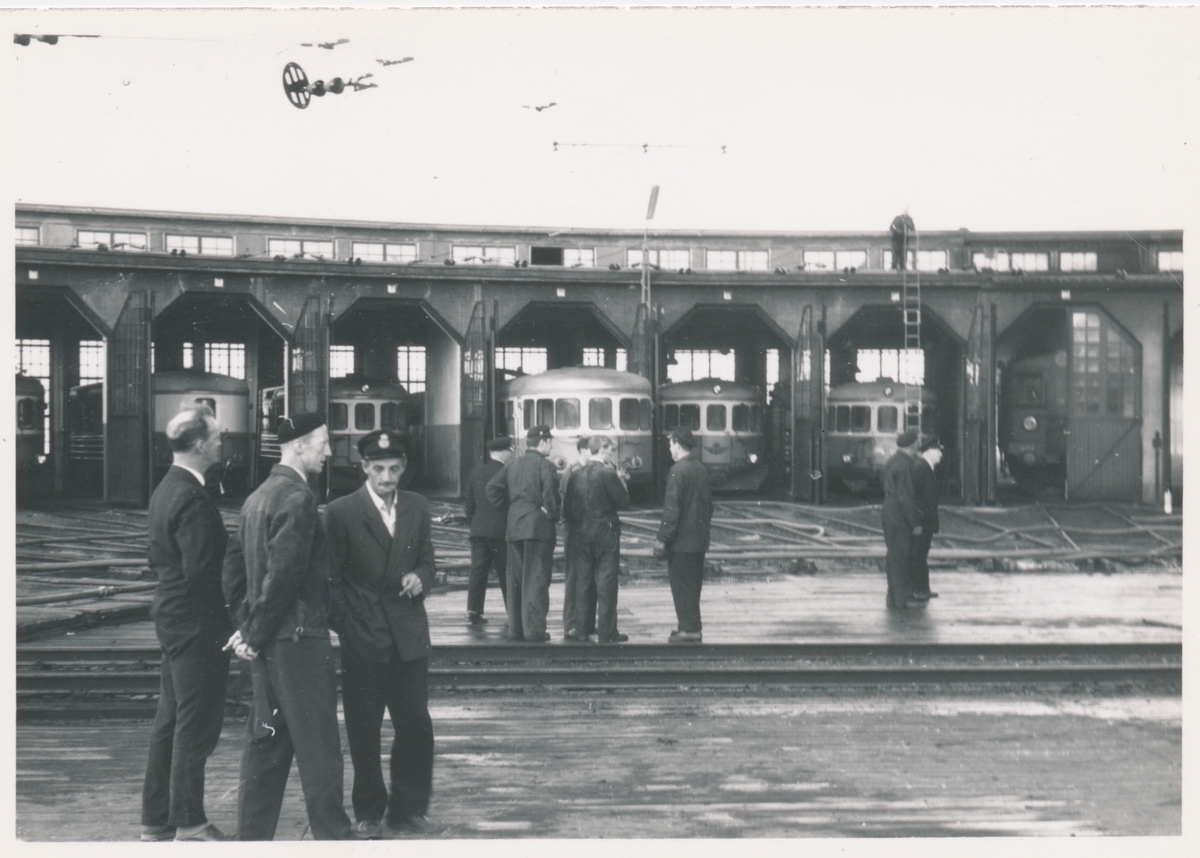 Titel: Chefer och personal tittar på lokstallet.