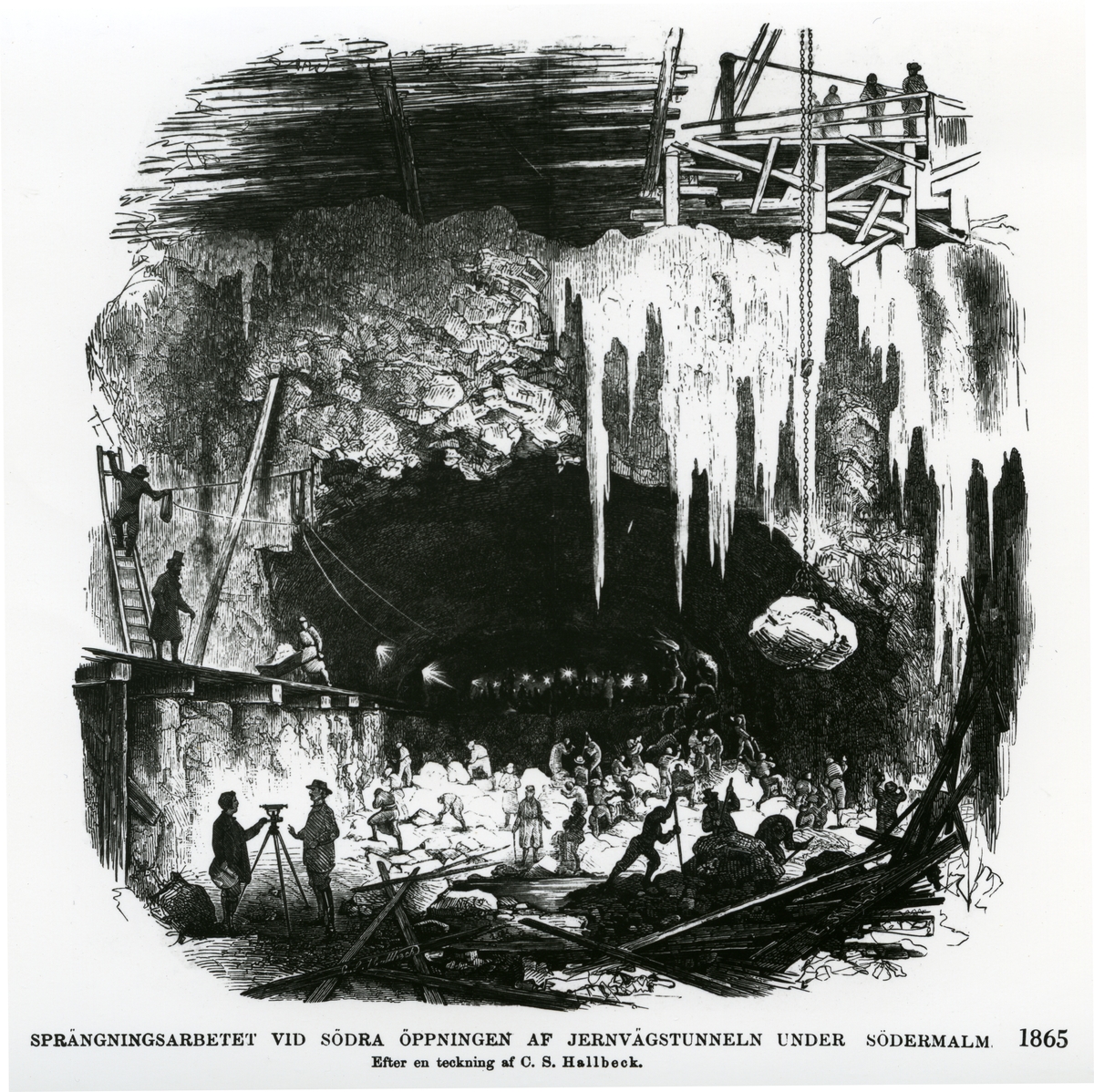 Titel: Sprängningsarbete för sammanbindningsbanan på linjen mellan Södra och Norra Tunnelmynningen.