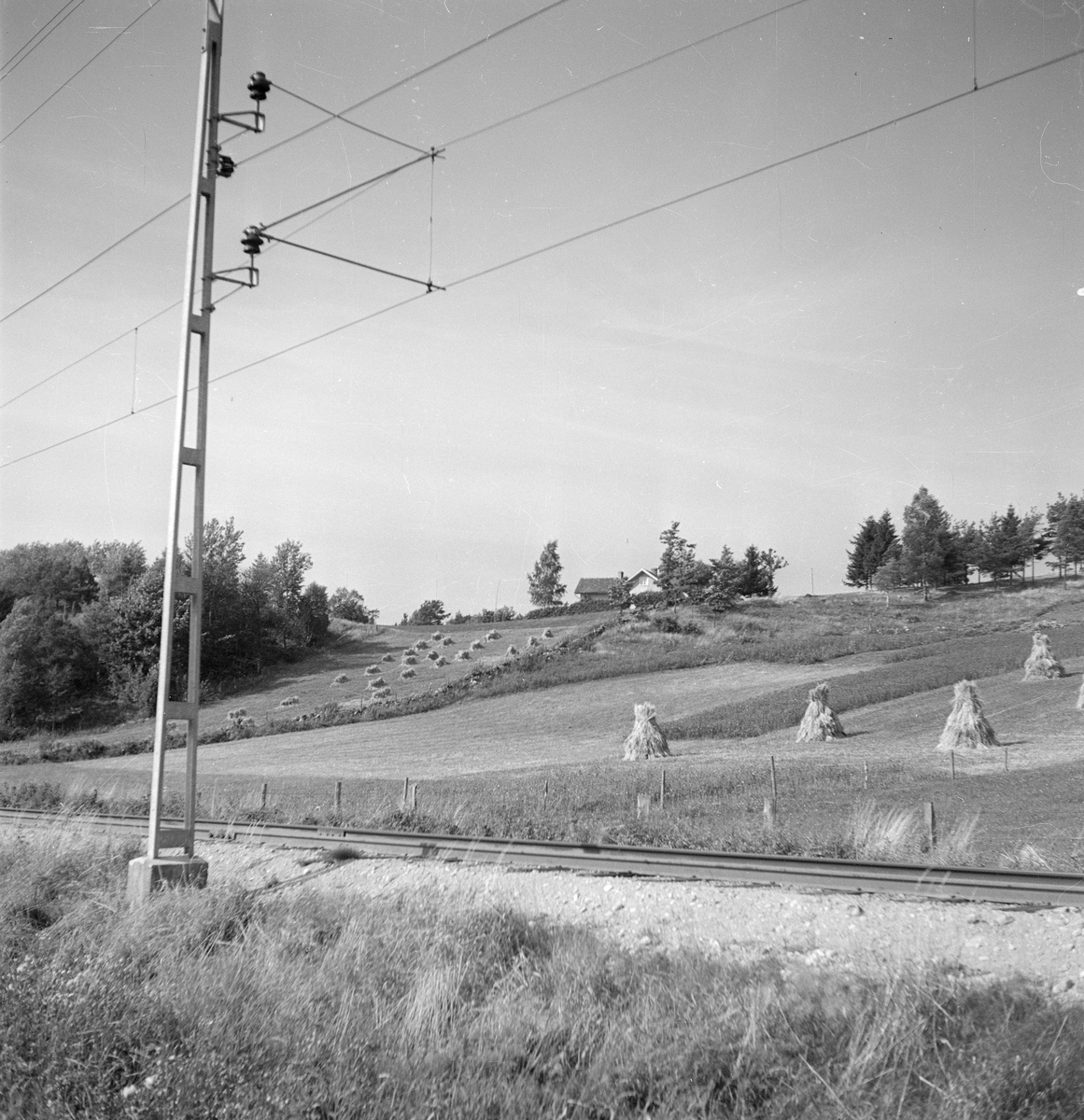 Linjebild från Herrljungatrakten. Jordbrukslandskap. Åker med nyslaget hö.