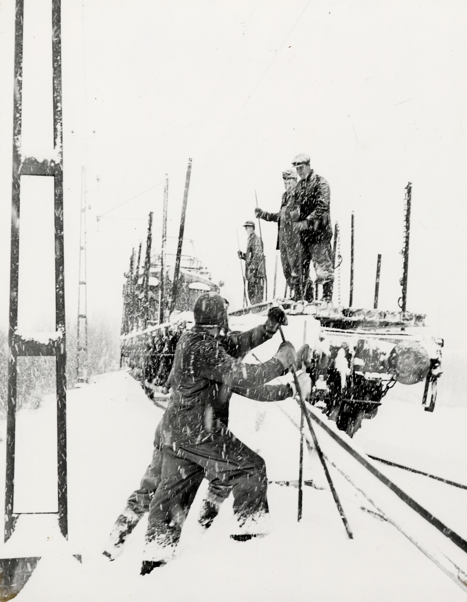 Lastning av utbytesräls vid Forsmo-Selsjön, Norra Stambanan. Vinterbild.