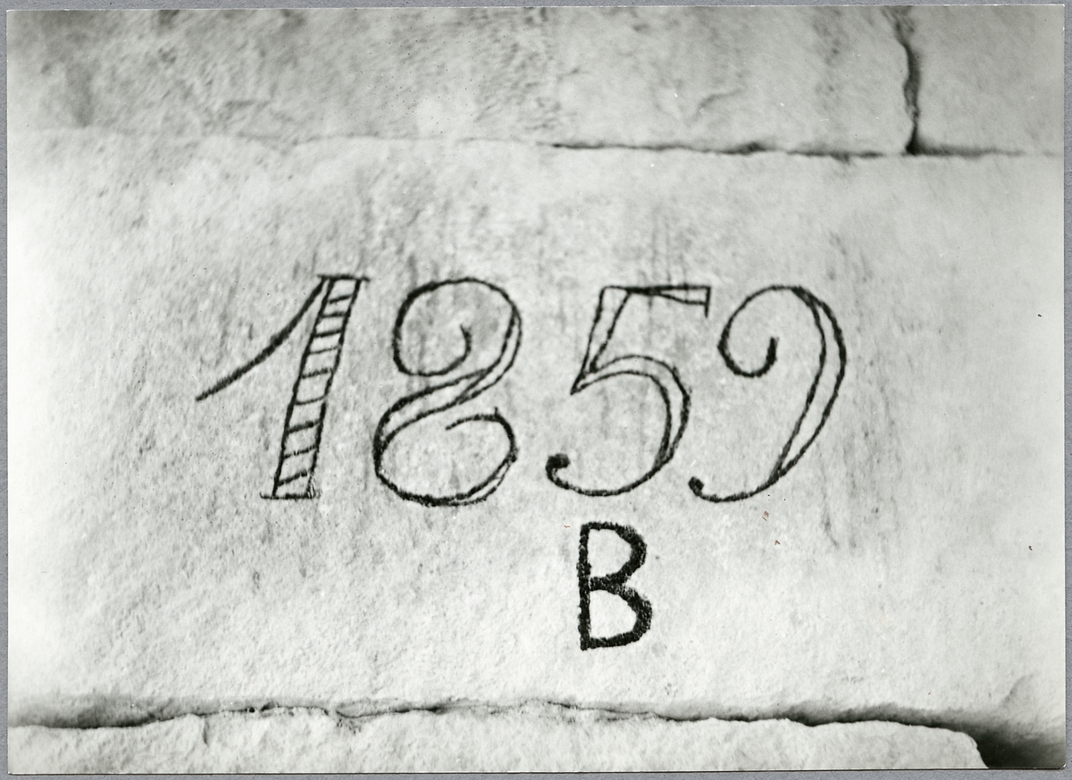 Titel: Årtalet 1859 och B inhugget i viadukt vid Tullinge station.