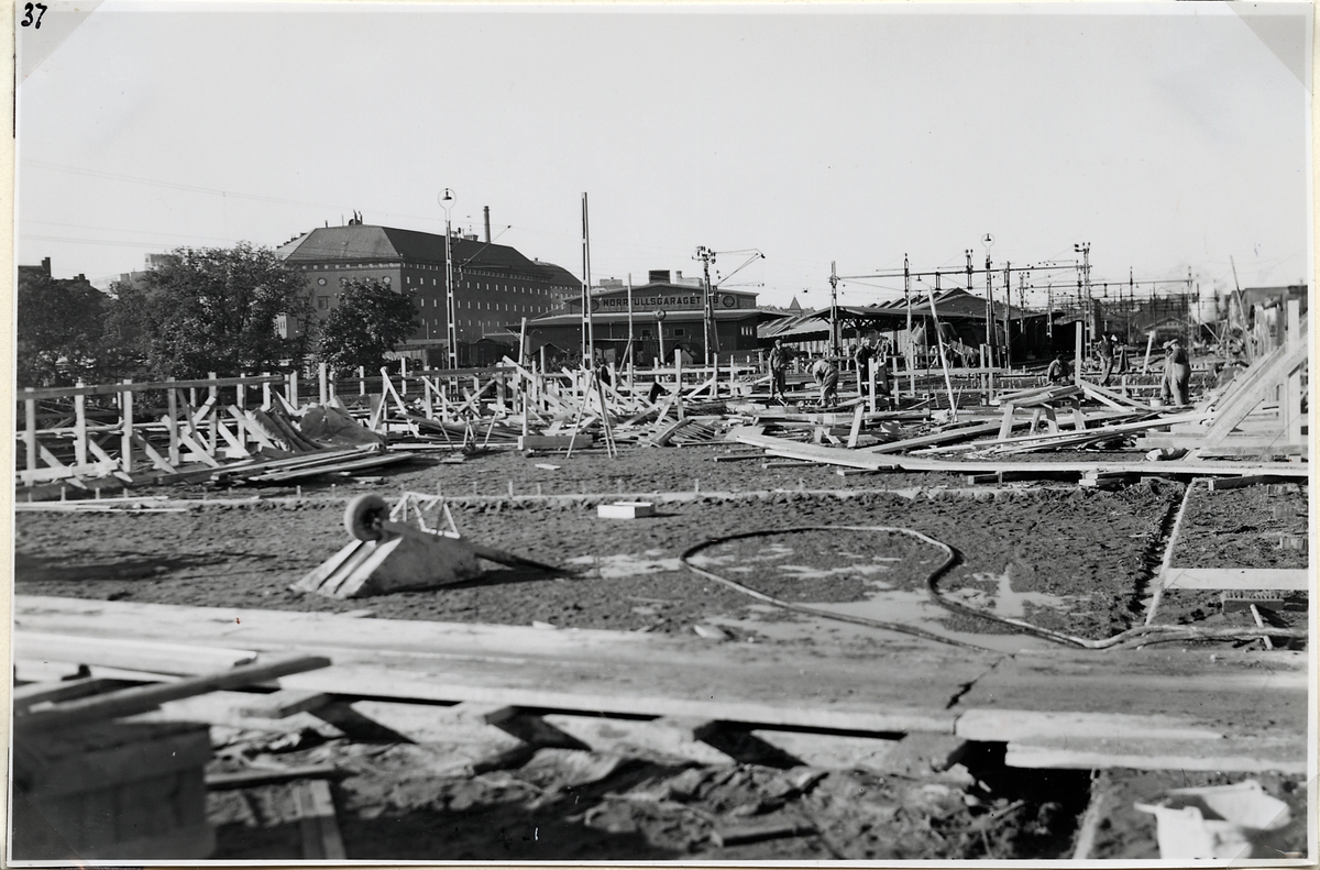 Titel: Byggnationen av ny järnvägsviadukt över Norrtullsgatan. Brobana färdiggjuten och täckt med gruslager.