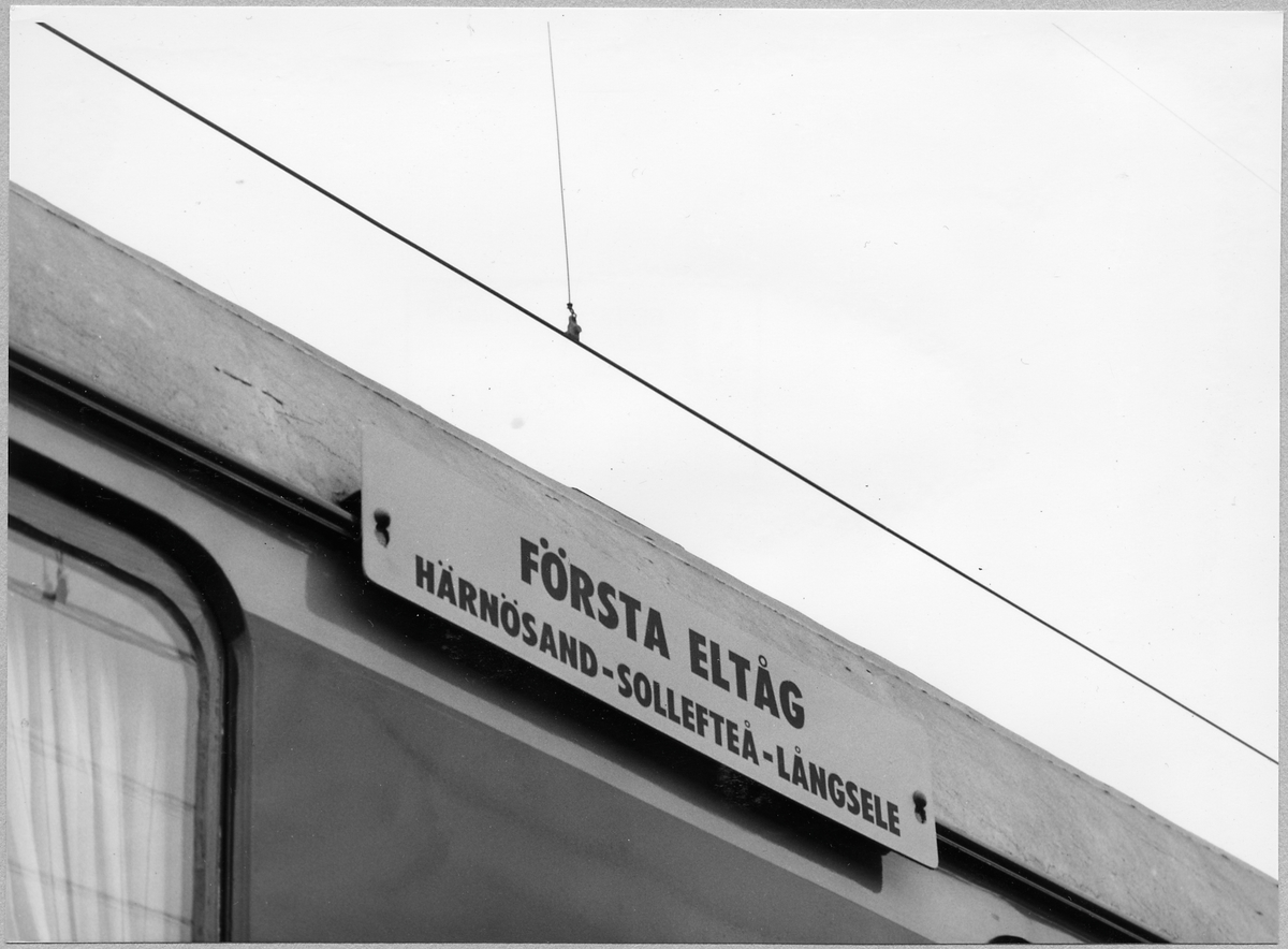 Skylt på tåg vid invigningen av eldriften på sträckan Härnösand - Sollefteå - Långsele.