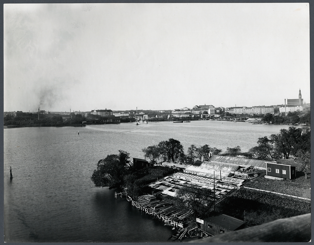Titel: Vy över Årstaholmarnas trädgårdsodling från Årstabron. Liljeholmsbron i bakgrunden.