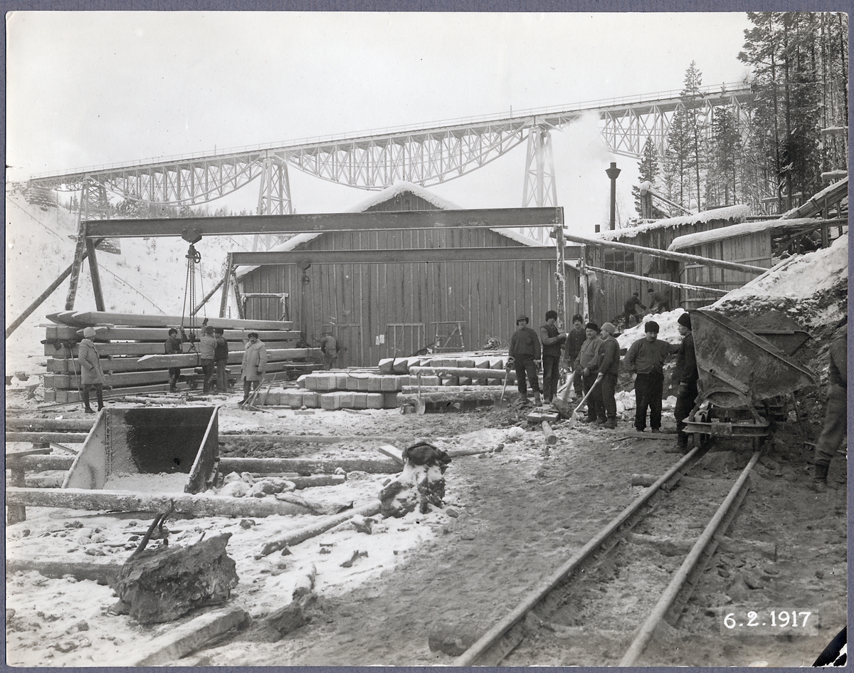 Titel: Pålupplag utanför verkstaden vid Öreälv.