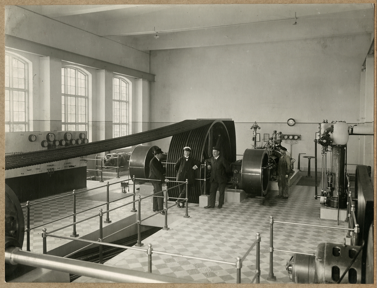 Maskinhall med en ångmaskin där kraftöverföringen sker med transmissionslinor. Statens Järnvägars slipersfabrik i Piteå.
