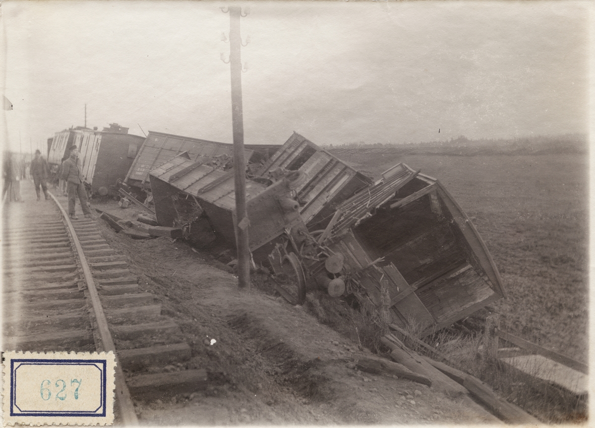 Titel: Urspårade vagnar vid telefonstolpe med personal i bakgrunden på linjen mellan Älmhult och Killeberg.