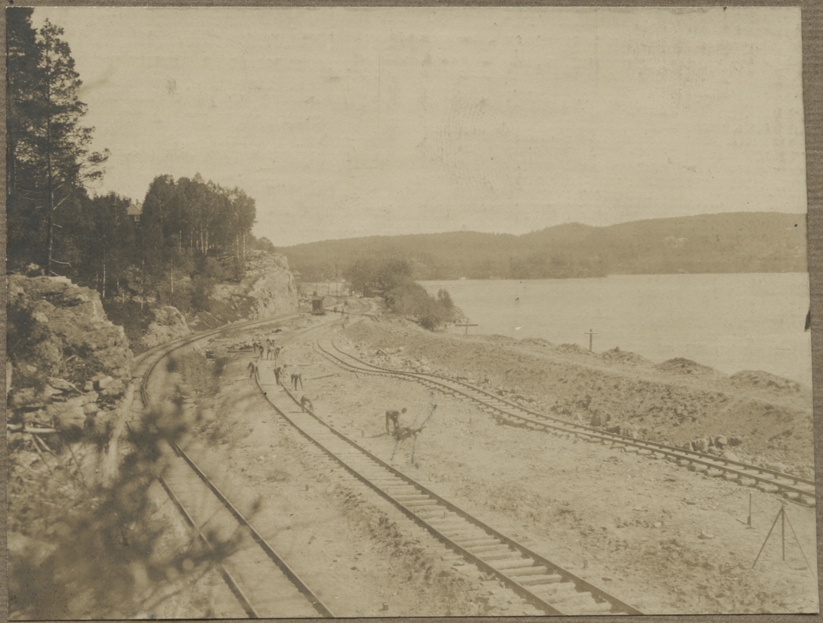 Dubbelspårsbanbyggnad Göteborg - Alingsås. Till vänster ses det provisoriska förbigångsspåret vid sjön Stor Sävelången, väster om Norsesund, år 1916.