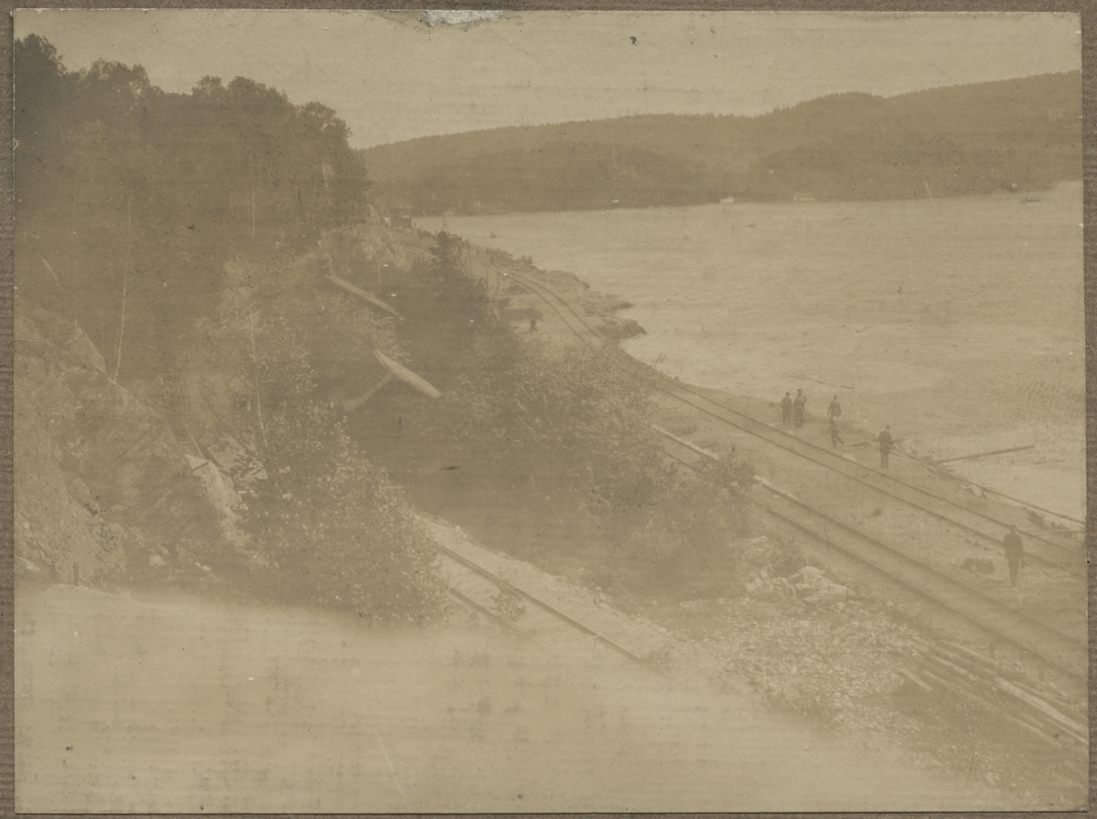Dubbelspårsbanbyggnad Göteborg - Alingsås. Detta foto är taget efter bottensprängningen. Det provisoriska förbigångsspåret till vänster i förgrunden, år 1916.
