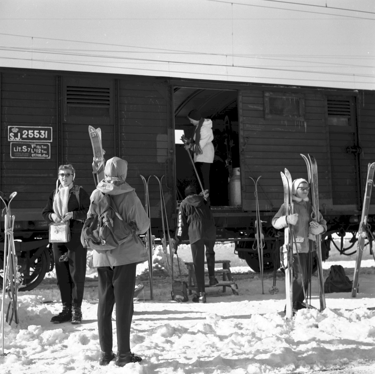 Statens Järnvägar, SJ S 25531. Vintertåghem i Storlien. Skidåkare