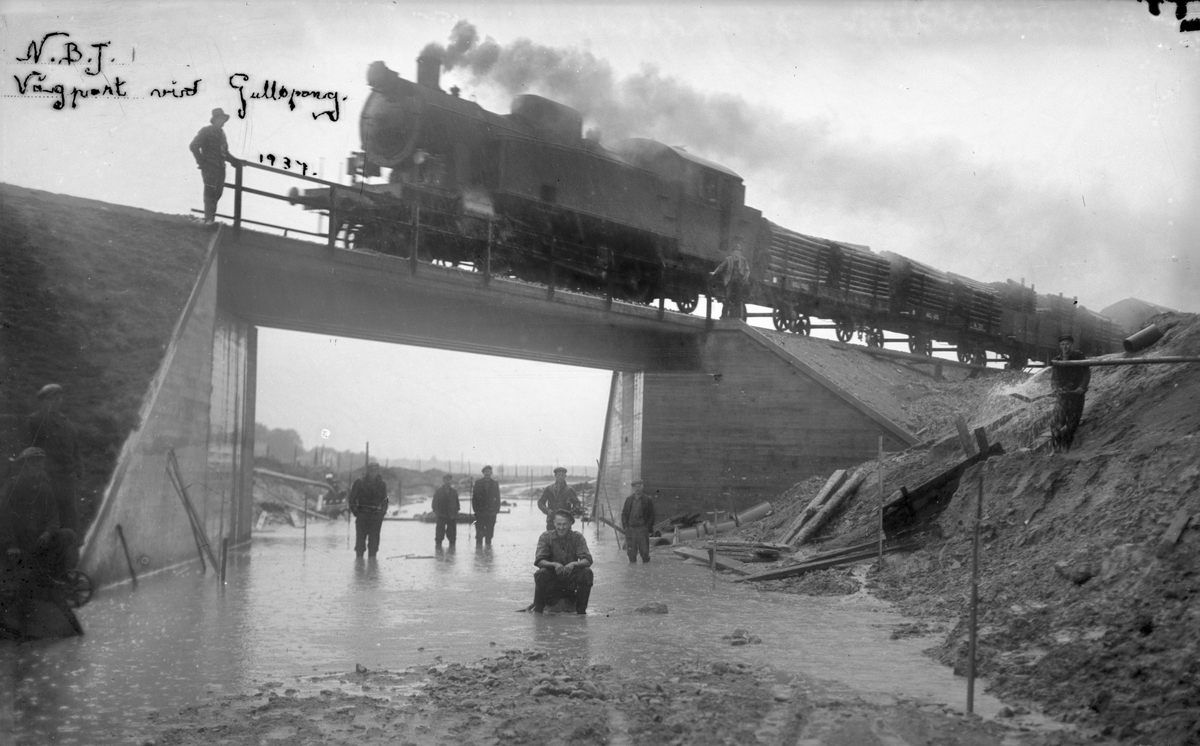 NBJ lok 16 "Krassin", med godståg passerar över den nybyggda vägporten i Gullspång 1937. Loket byggdes av Nydqvist & Holm AB 1928 för Nora - Bergslags Järnväg. Är numera museilok på Nora Bergslags Veteran-Jernväg.