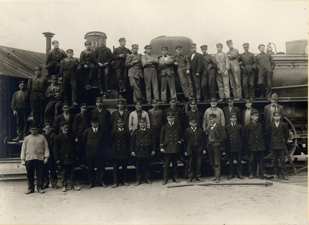 Personalen vid Hallsbergs lokstation 1910. Stående första raden i mitten lokmästare Lindqvist, på dennes högra sida stallförman Carl Johan Eriksson och på vänster sida reparatör Lindskog.
