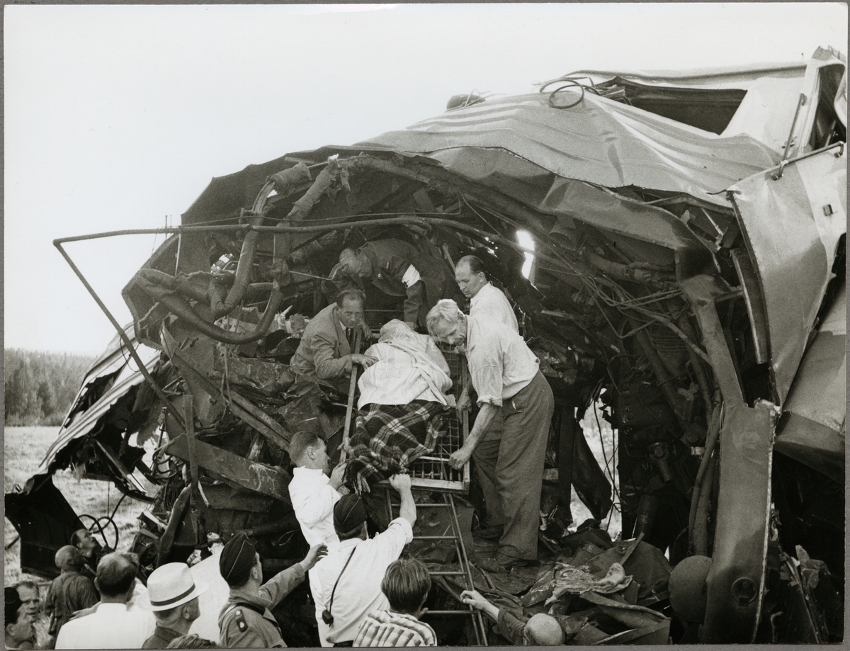 Hjälparbete efter kollision mellan ett extratåg och ett rälsbusståg på linjen mellan Grycksbo och Sågmyra 1958.