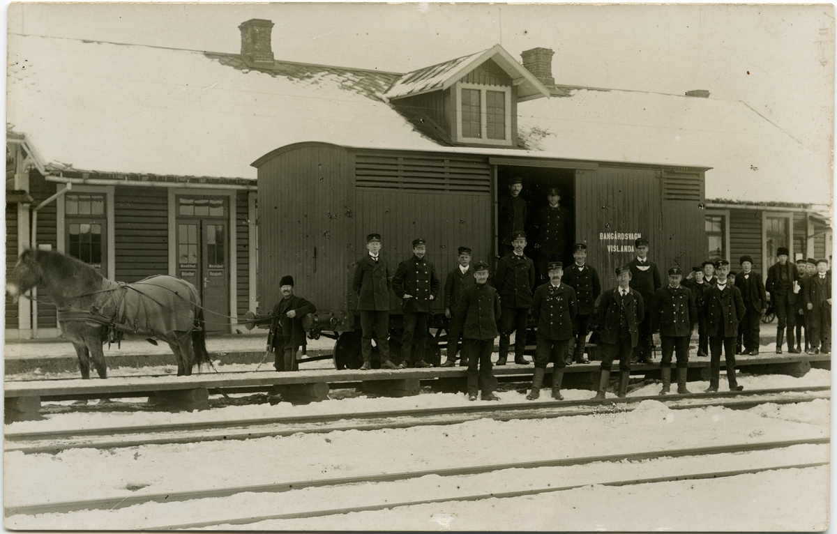 Titel: Vislanda station. Rangering av godsvagn med växlingshäst. Personal uppställd för fotografering.