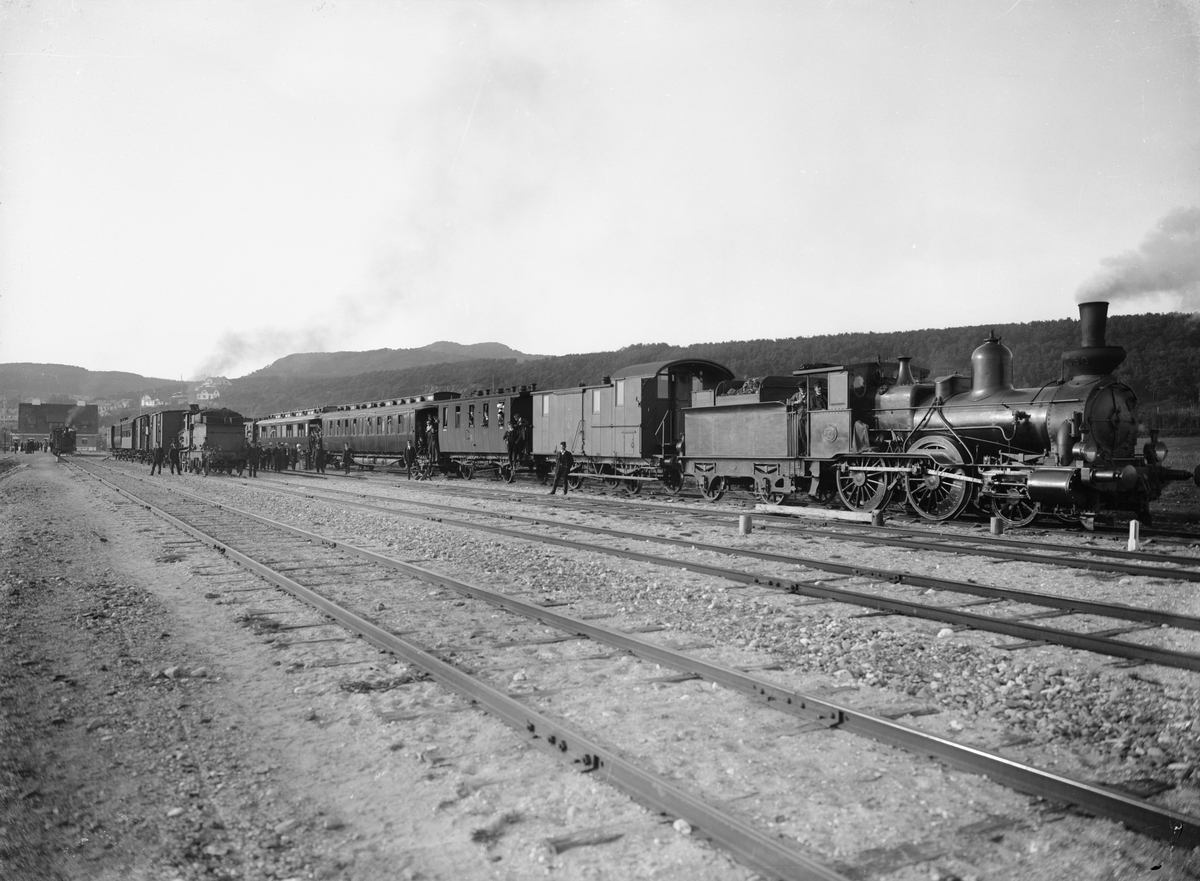 Statens Järnvägar, SJ Da2 350. Ånglok med persontåg. Loket tillverkades 1887 av Motala Verkstad. Såld 1918 som skrot till Bröderna Edstrand AB, Malmö.