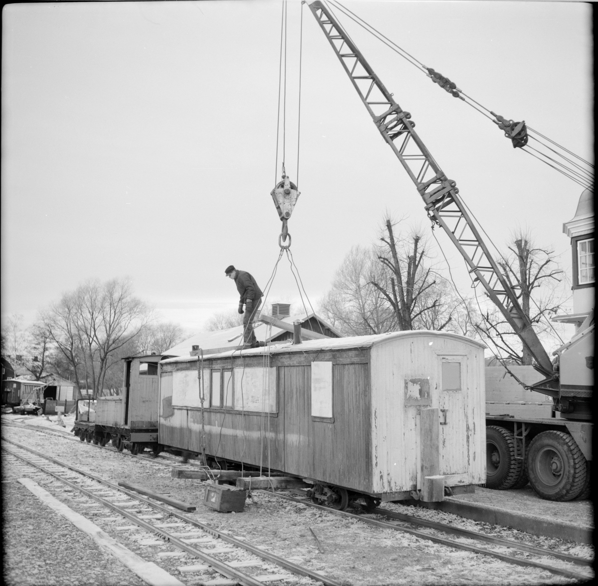 Lossning av godsvagn från kran utanför stationshuset i Mariefred som användes av Museijärnväg Östra Södermanlands Järnväg, ÖSlJ. Ackumulatorlok 15 "Garpen" ses framför vagnen.