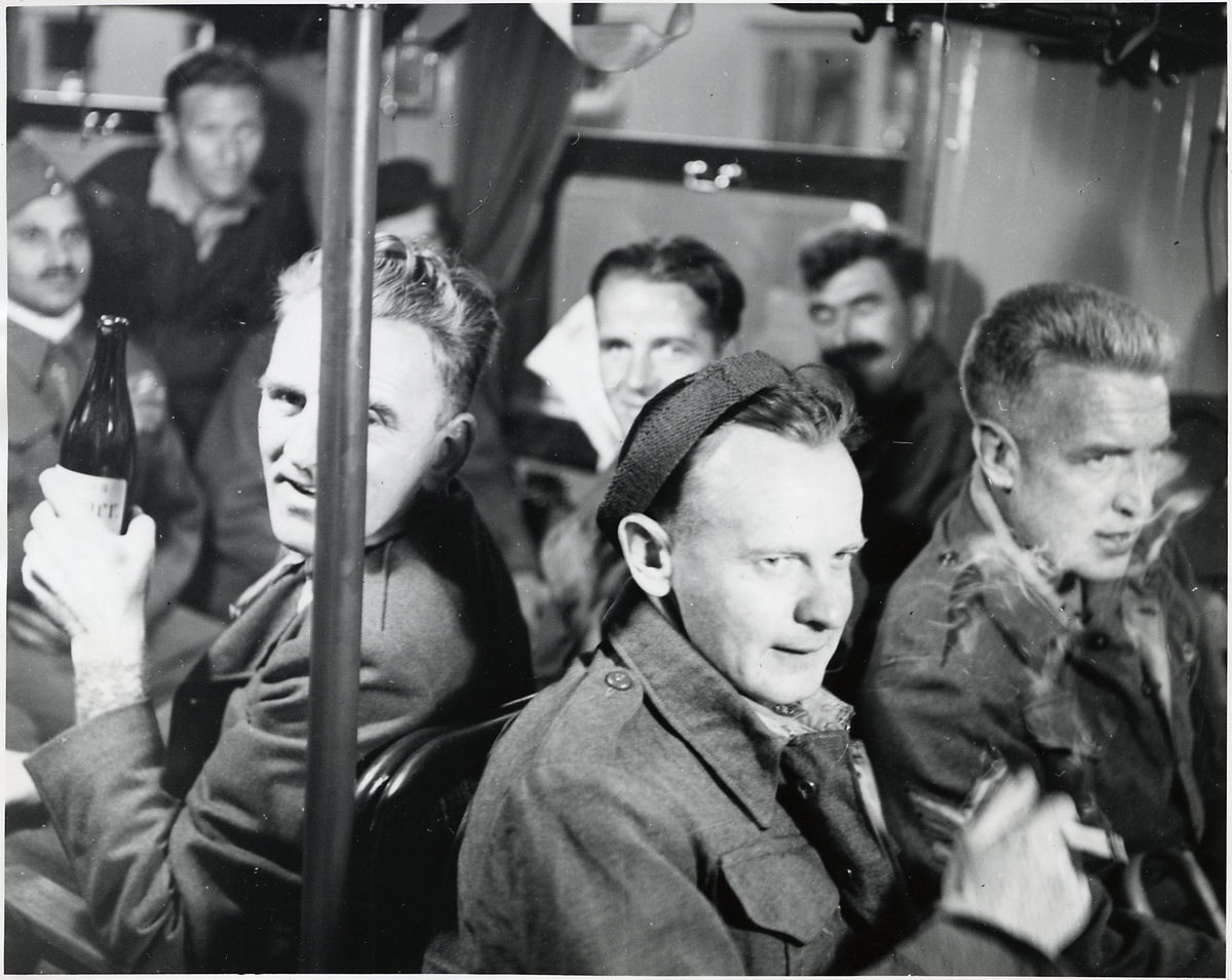 Allieade krigsfångar ombord på tåg under krigsutväxling.