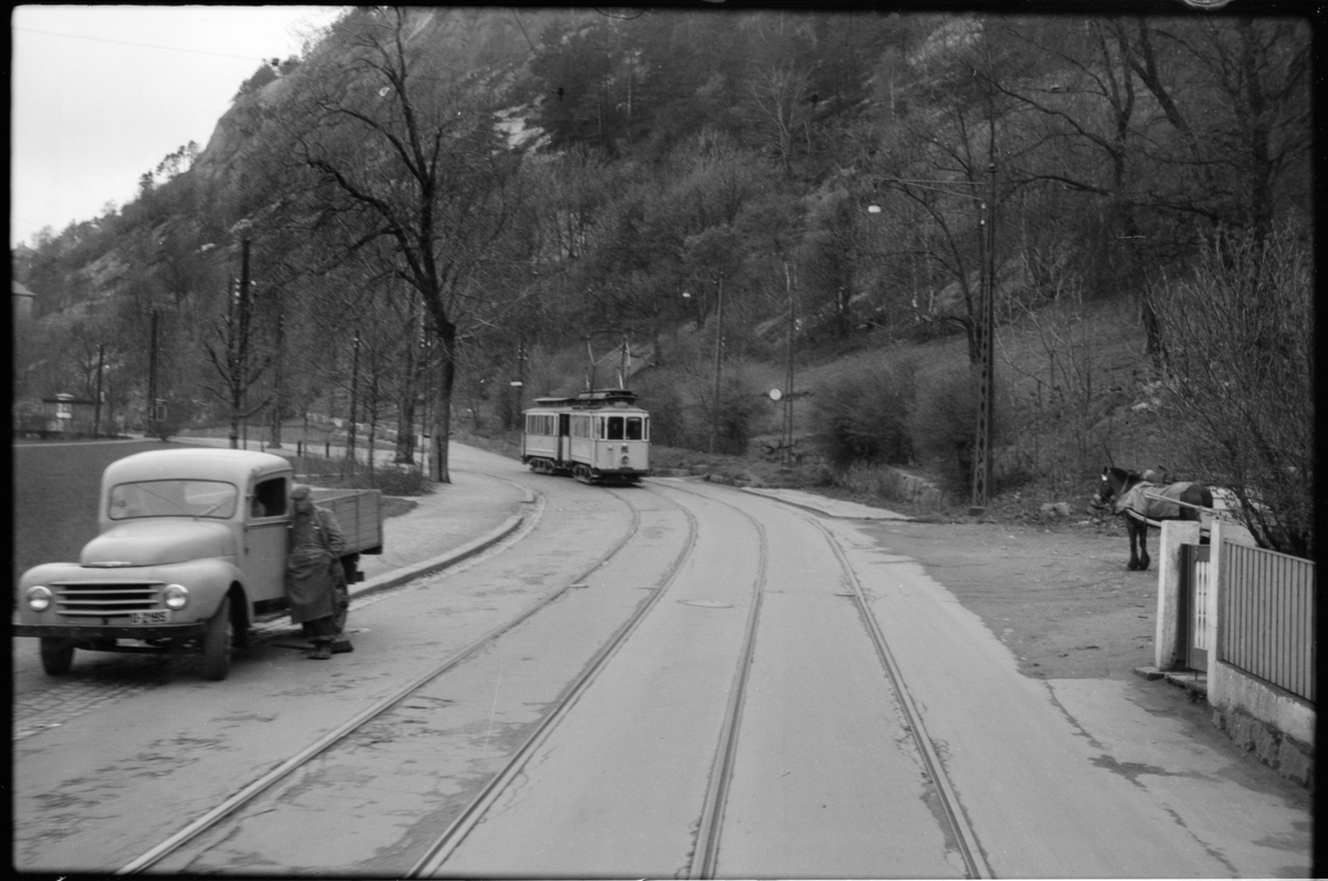 Bergen Sporvei Aktieselskabet, BS spårvagn i trafik. Till vänster i bild, lastbil med personal utanför och till höger, en häst transport.