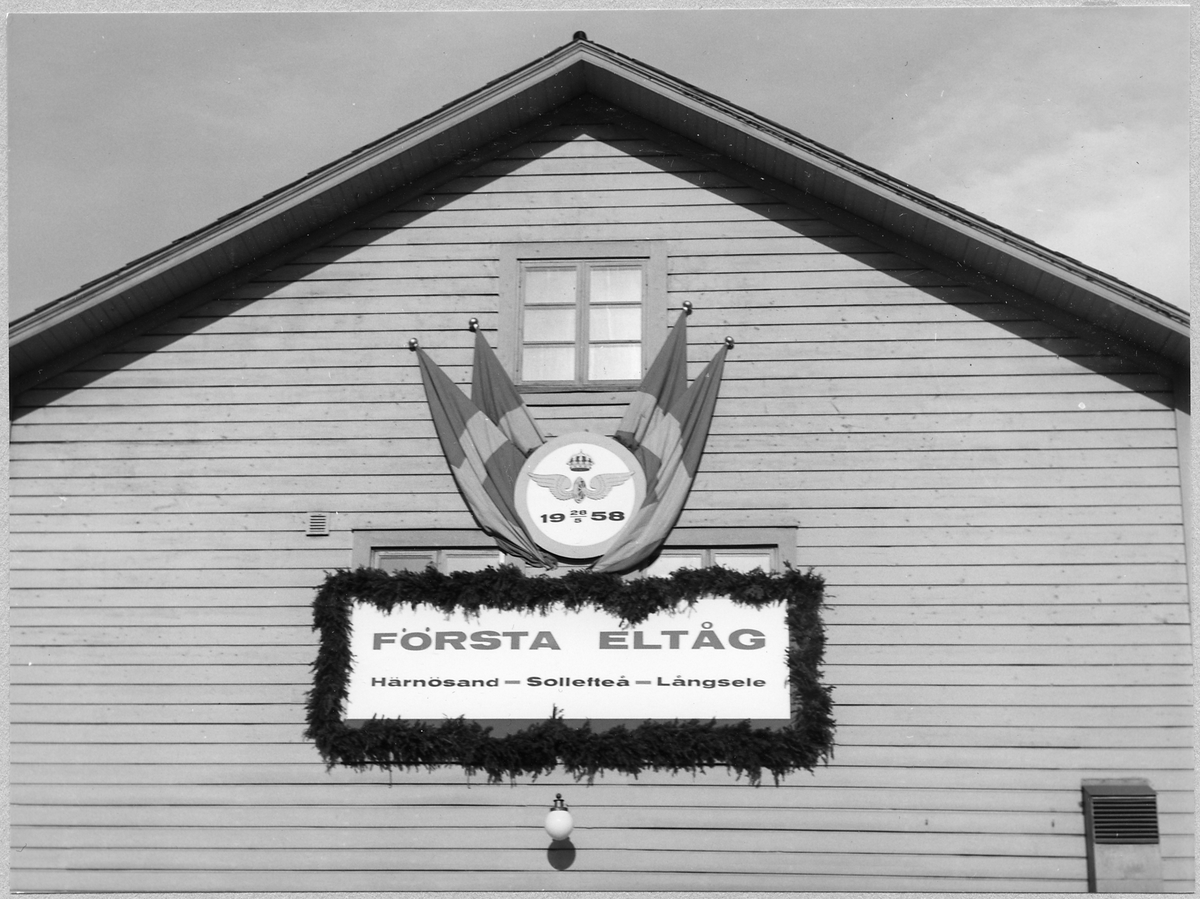 Utsmyckningar vid Långsele station i samband med invigningen av eldriften på sträckan Härnösand - Sollefteå - Långsele.