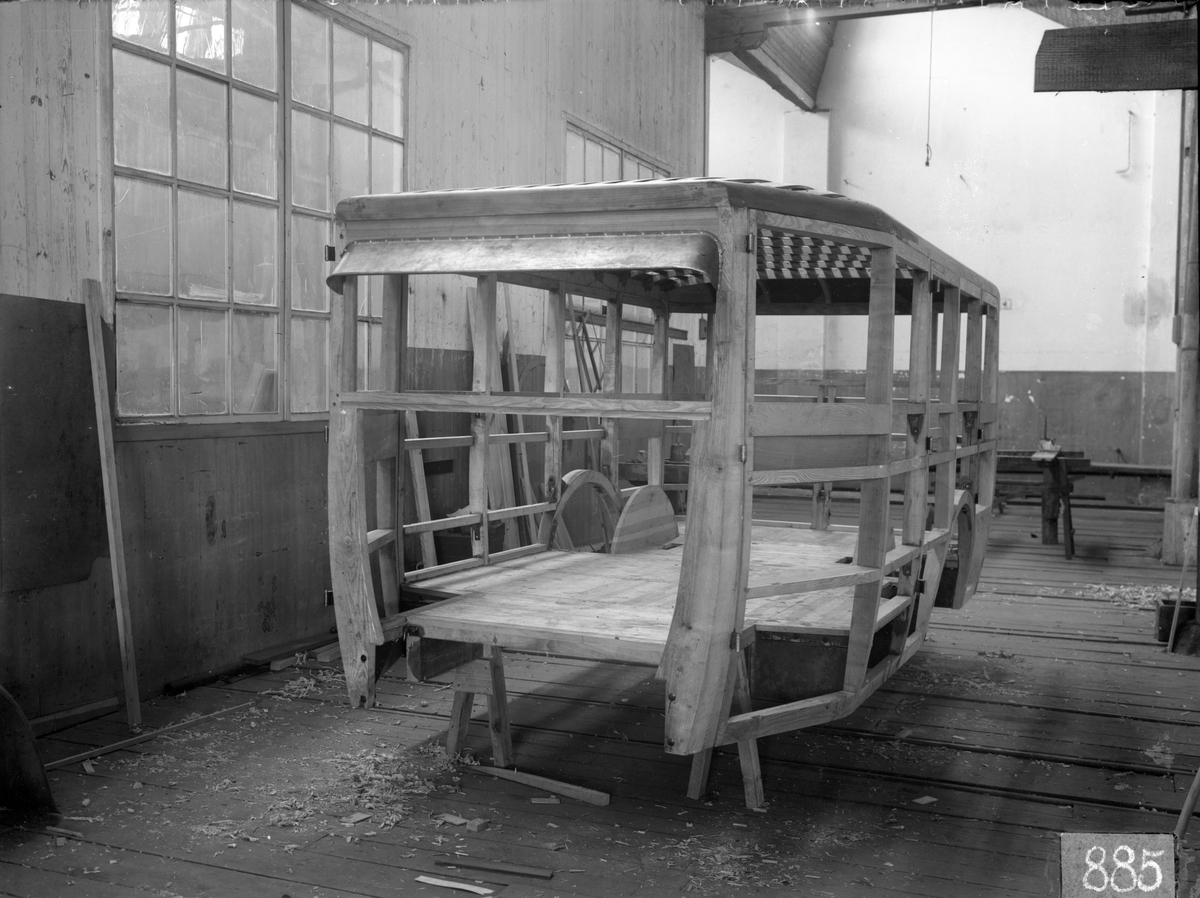 Chevroletbuss under byggnad. AB Svenska Järnvägsverkstäderna s verkstad i Linköping. AB Svenska Järnvägsverkstäderna använde främst chassier från Volvo, Skania-Vabis och Shevrolet för att bygga bussar. Tillverkningen av busskarosser skylde sig från kontrakt till att karossen med inredning, målning och andra detaljer blev gjurda.