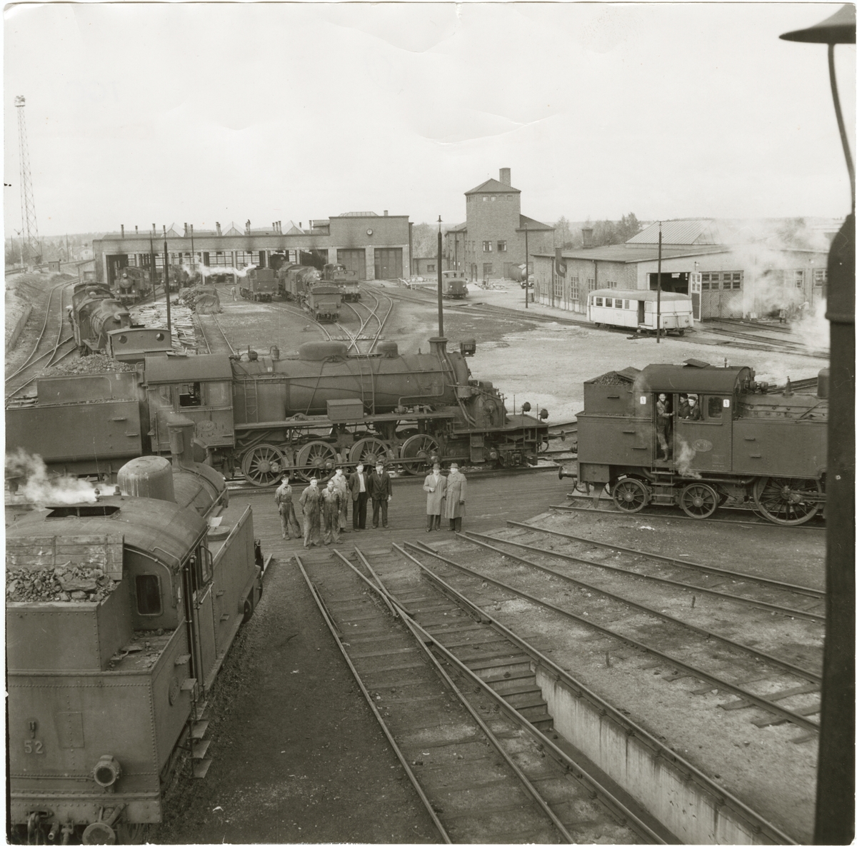 Vy över lokstallarna och bangården vid Eskilstuna C. Trafikaktiebolaget Grängesberg Oxelösunds Järnvägar, TGOJ S3 52 till vänster, TGOJ M3t 73 i mitten på vändskivan och TGOJ S3 91 till höger