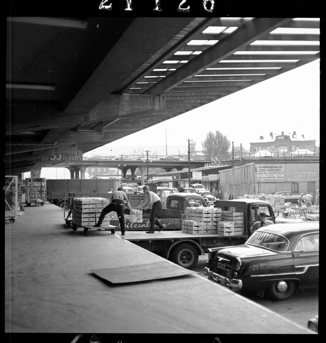 Omlastning av grönsaker från lastbil till i senare skede järnväg.