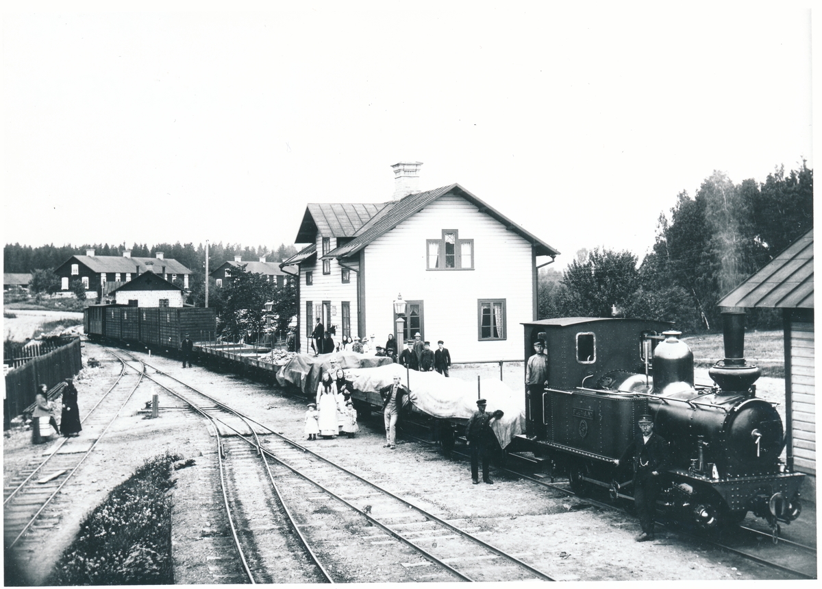 Långshyttan station. Tåget dras av Byvalla-Långshyttan Järnvägs ånglok BLJ lok 3 "Stjernsund" med tillverkningsnummer 54, tillverkat 1891.