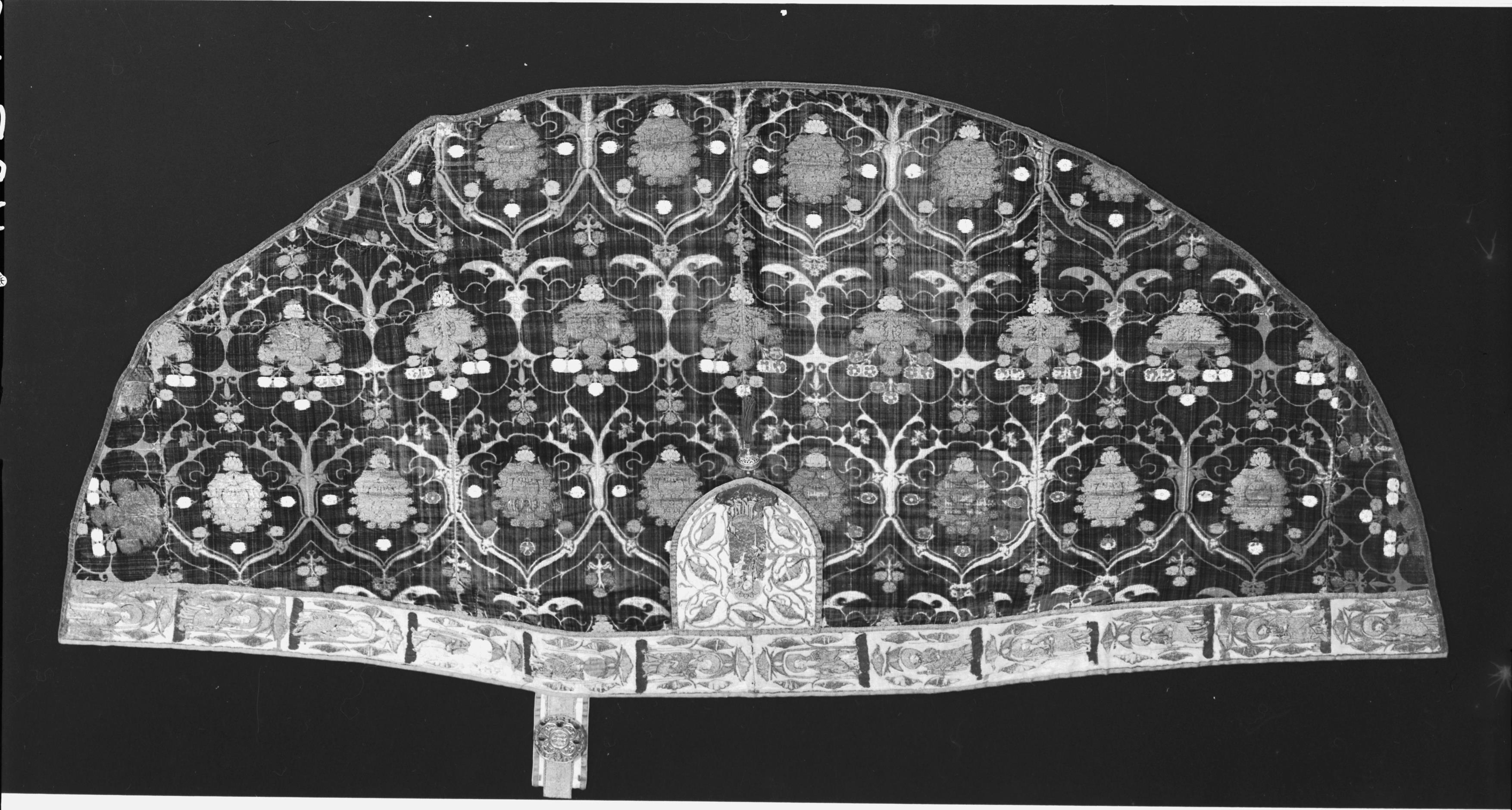 Korkåpa av röd italiensk granatäpplesammet med invävda blommor i guld och färger, 1400-talets första hälft.