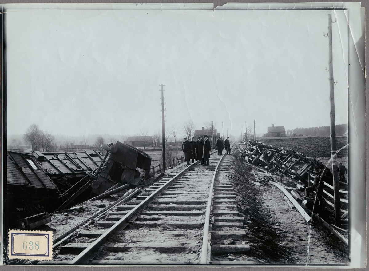 Olycksområde efter urspårning på linjen mellan Älmhult och Killeberg med personal, vagnar och lok i bild.