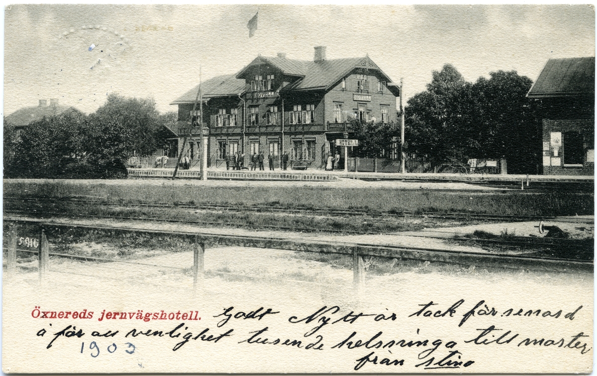 Öxnered järnvägshotell och station. Bergslagernas Järnväg, BJ. Stationen ligger till vänster på bilden.