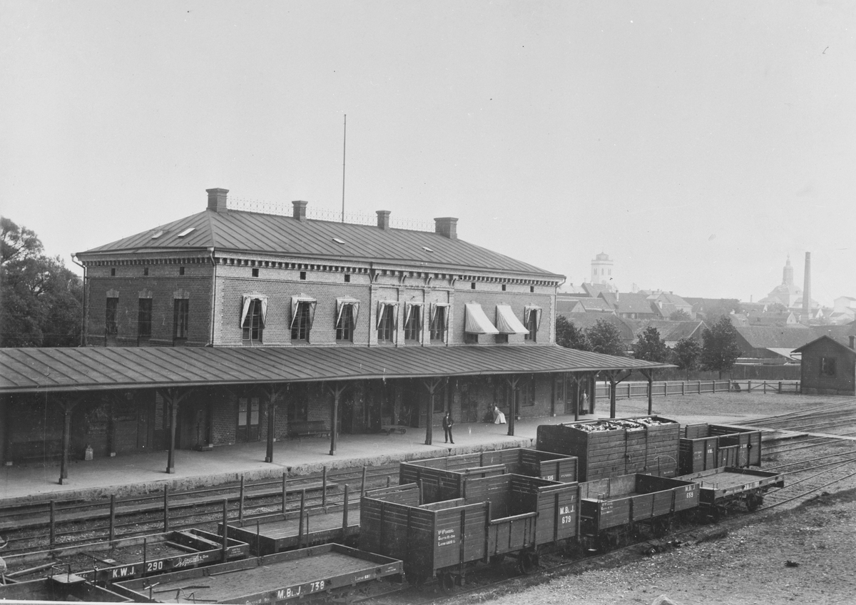 Karlshamn station byggd 1872-74. Blandade godsvagnar med följande littera: