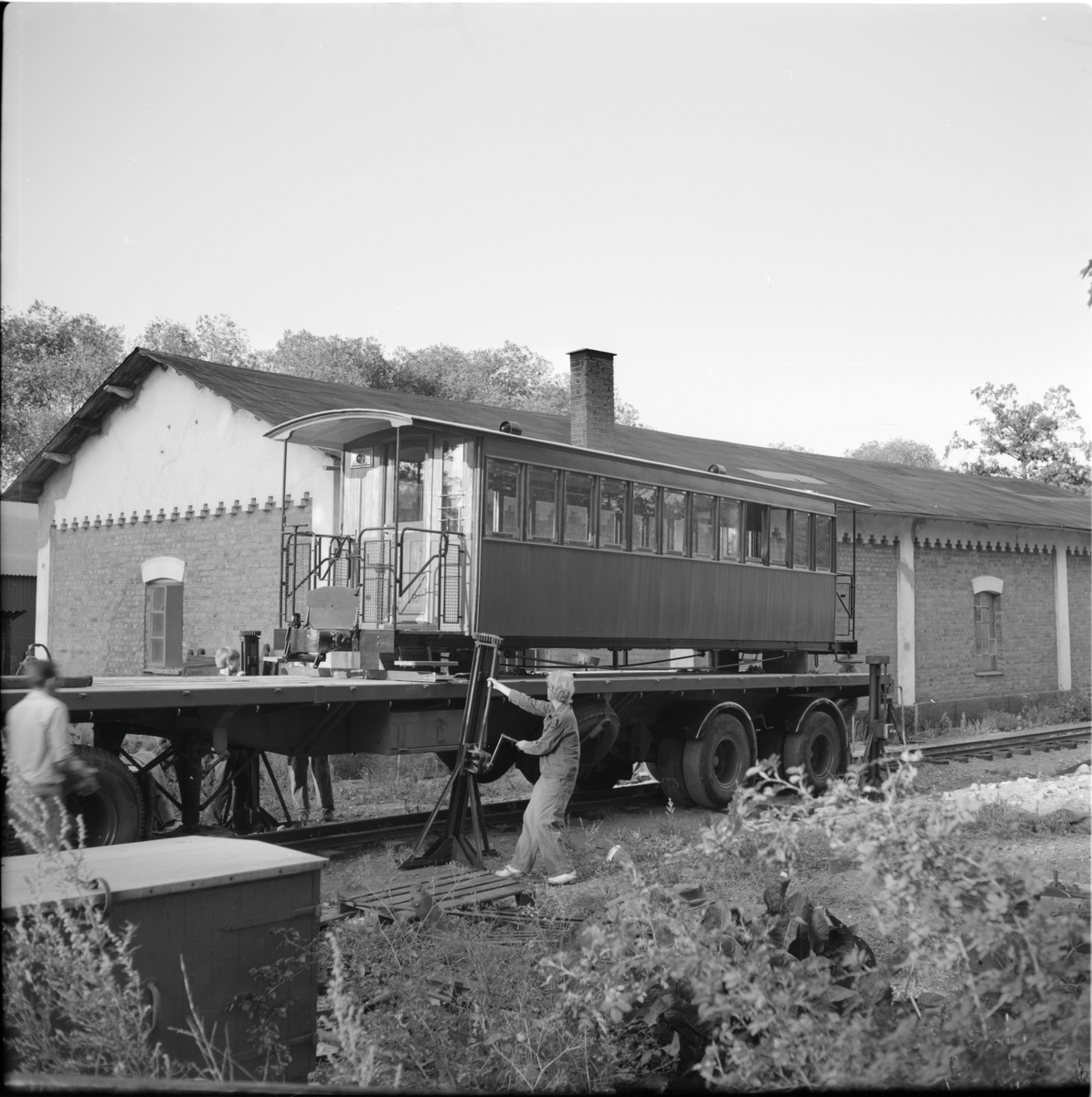 Utanför lokstallet i Mariefred som användes av Museijärnväg Östra Södermanlands Järnväg, ÖSlJ ses personal med domkraft. På lastbilsflaket står personvagn utan boggi.