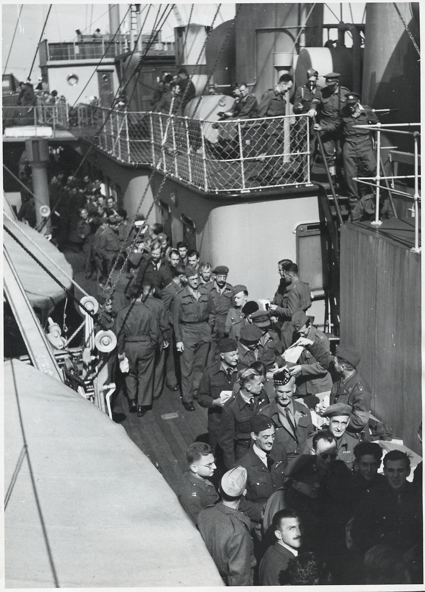 Krigsfångar som blir tilldelade påsar med förnödenheter ombord, på S/S Drottning Wictoria, från Röda Korset.