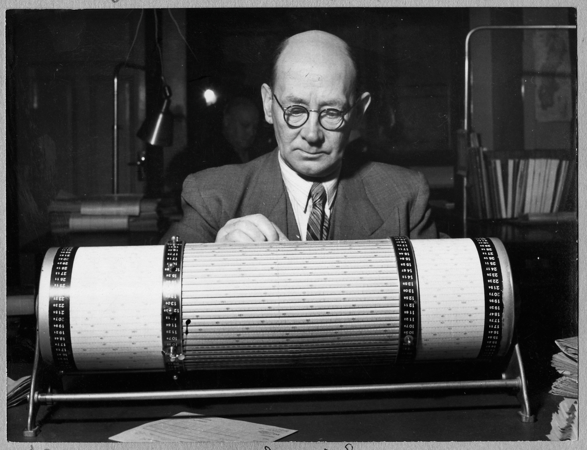 Oskar Ask vid sin räknemaskin Loga Calculator.
