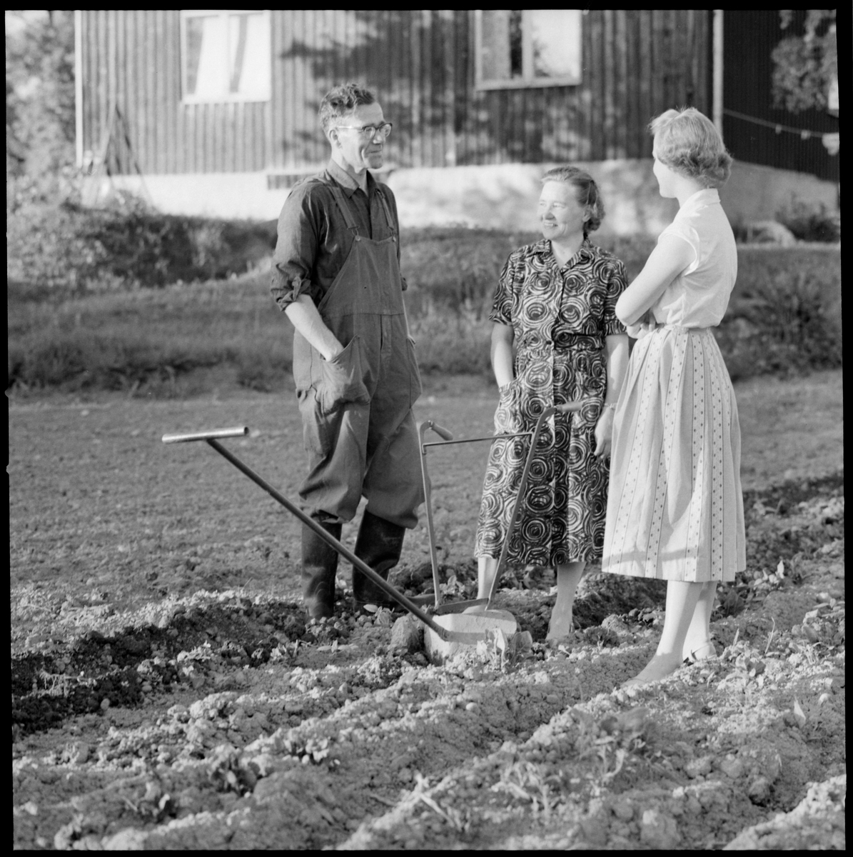 En TGOJ-anställd hemma på sin gård med sin familj vid handplogen. Trafikaktiebolaget Grängesberg-Oxelösund Järnvägar.