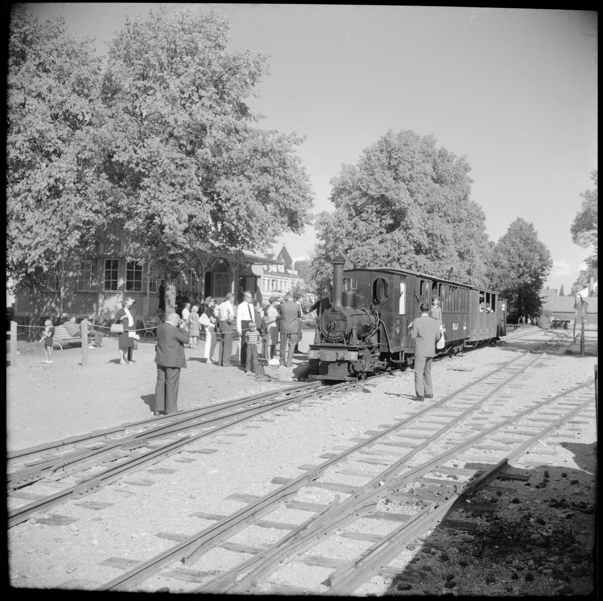 Resande vid Östra Södermanlands - Järnväg, ÖSlJ lok 2 "Lotta", Kosta - Lessebo Järnväg, KLJ personvagn på stationen i Mariefred.